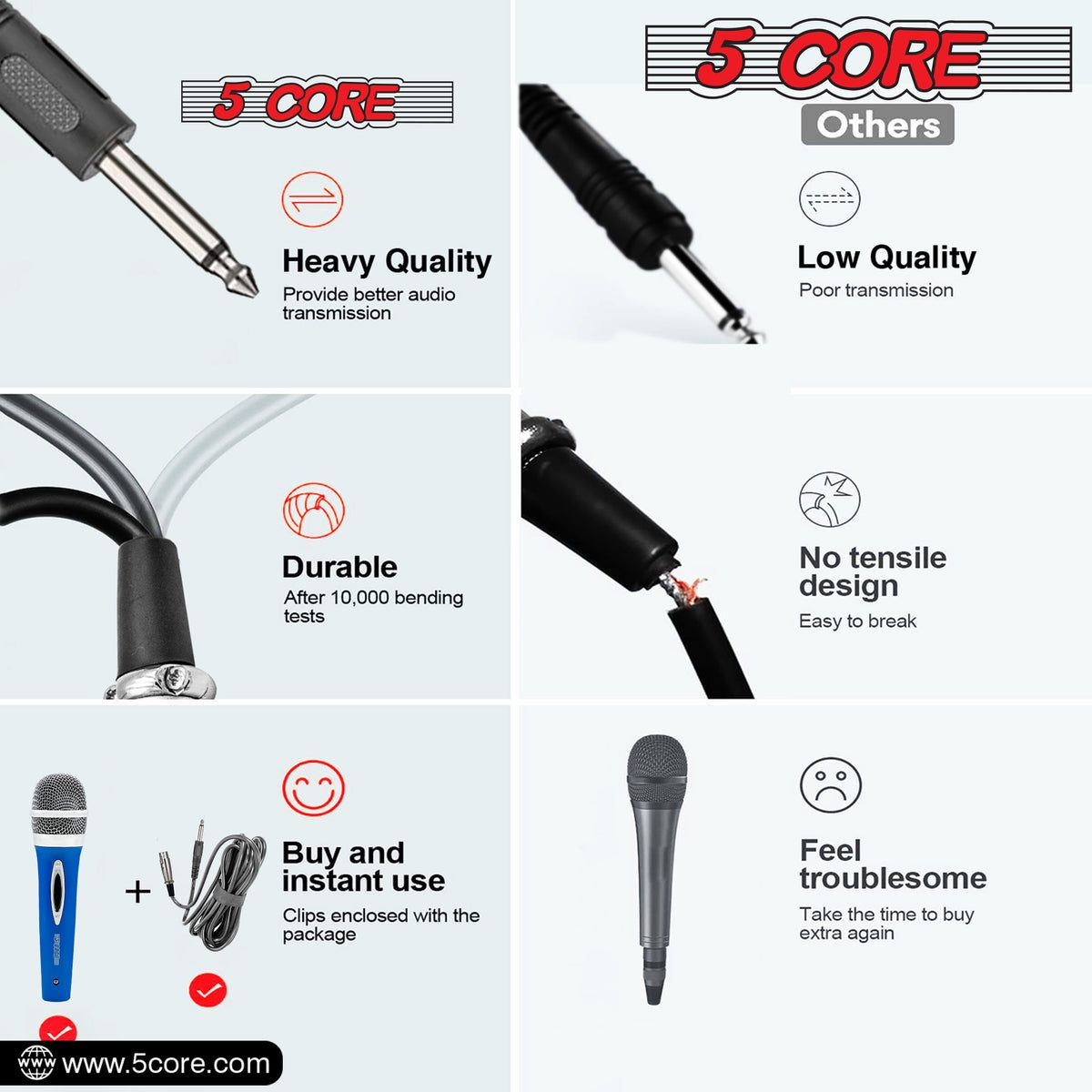 Experience superior audio quality with the 5 Core cardioid karaoke microphone, designed to deliver brilliant sound reproduction while reducing noise and feedback. The wide frequency response in the dynamic microfono ensures consistent sound pickup from the source and keeps its natural form. You don't need to do a lot of equalization to get the perfect sound. This is a professional vocal microphone for singing, designed to offer you clarity and amazing sound. A standard wired XLR to 1/4 inch plug connection lets you enjoy reliable performance. There is no latency or radio wave interference. This rugged plastic microphone is made from fresh ABS material with a reinforced steel windscreen to safeguard internal components. Even if you drop the anti-dent ring, keep this microfono safe. Ideal vocal microphone for singing, karaoke, DJ, PA, speeches, and more. This dynamic microphone XLR is your go-to for clear, reliable, and professional performance. |