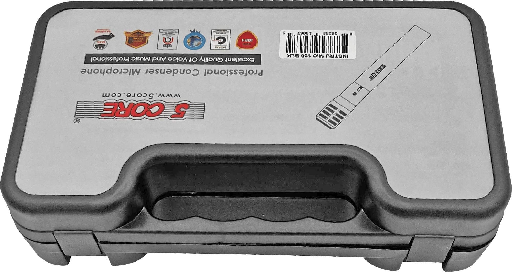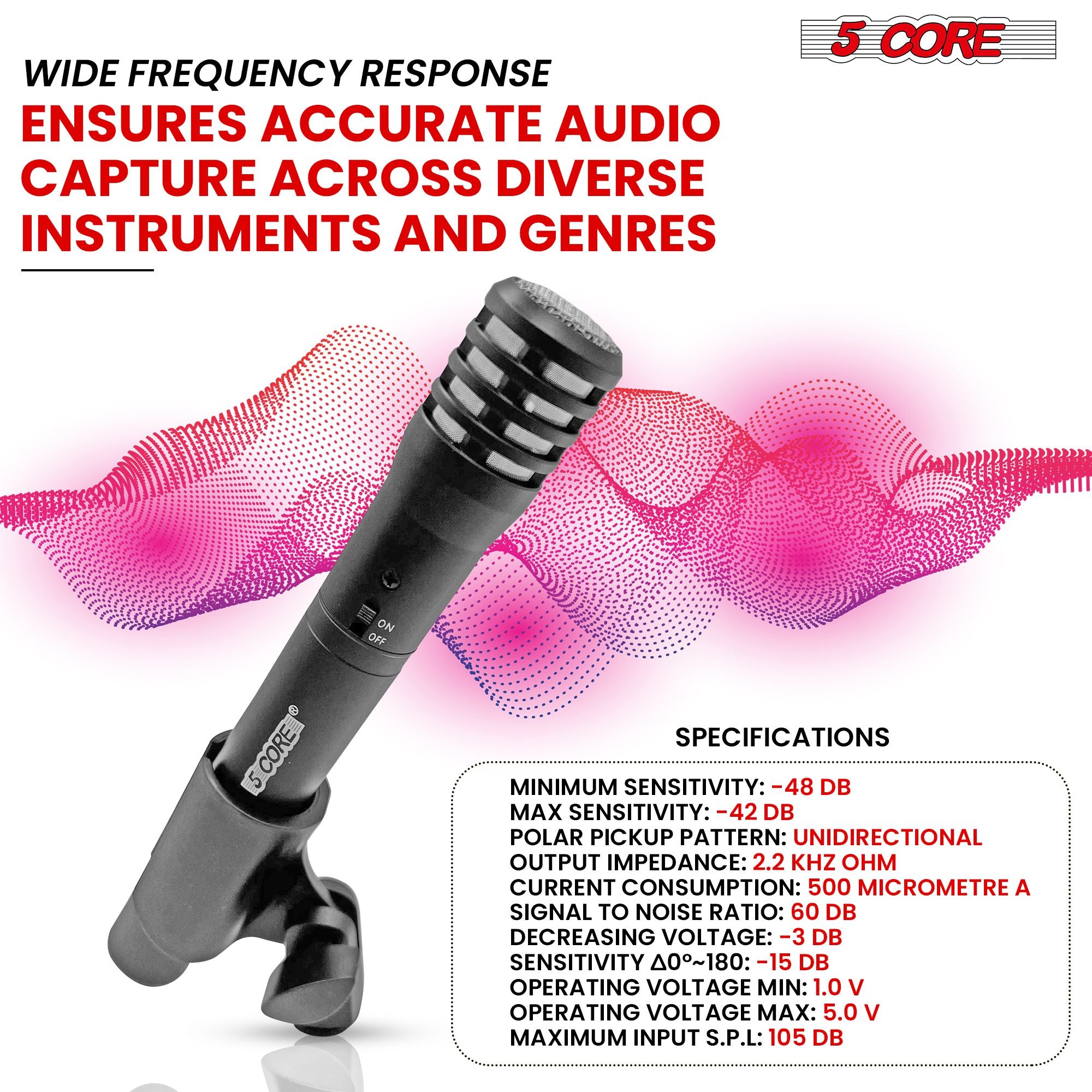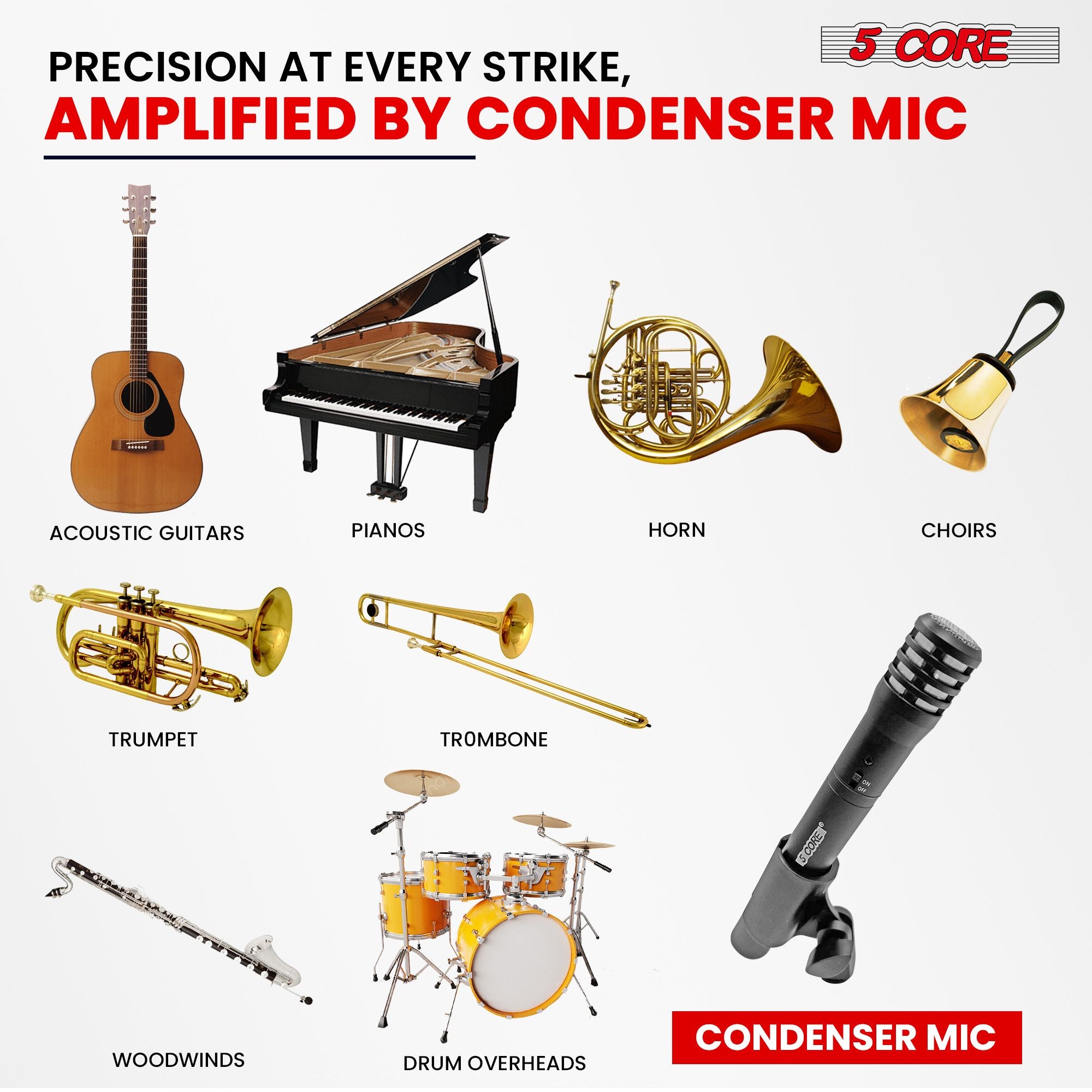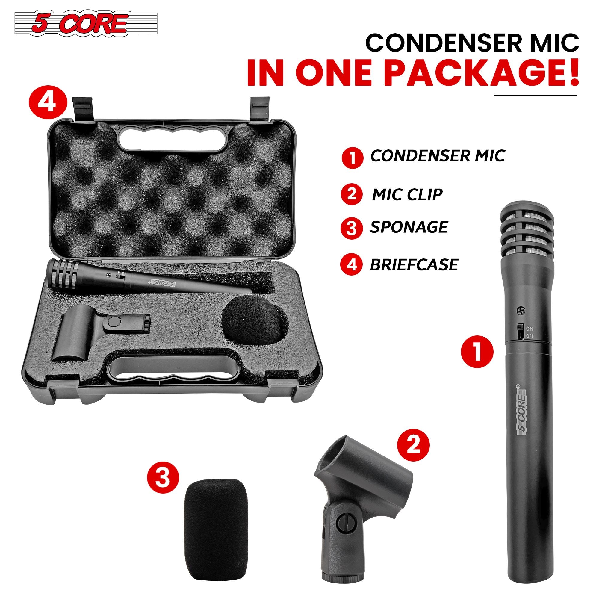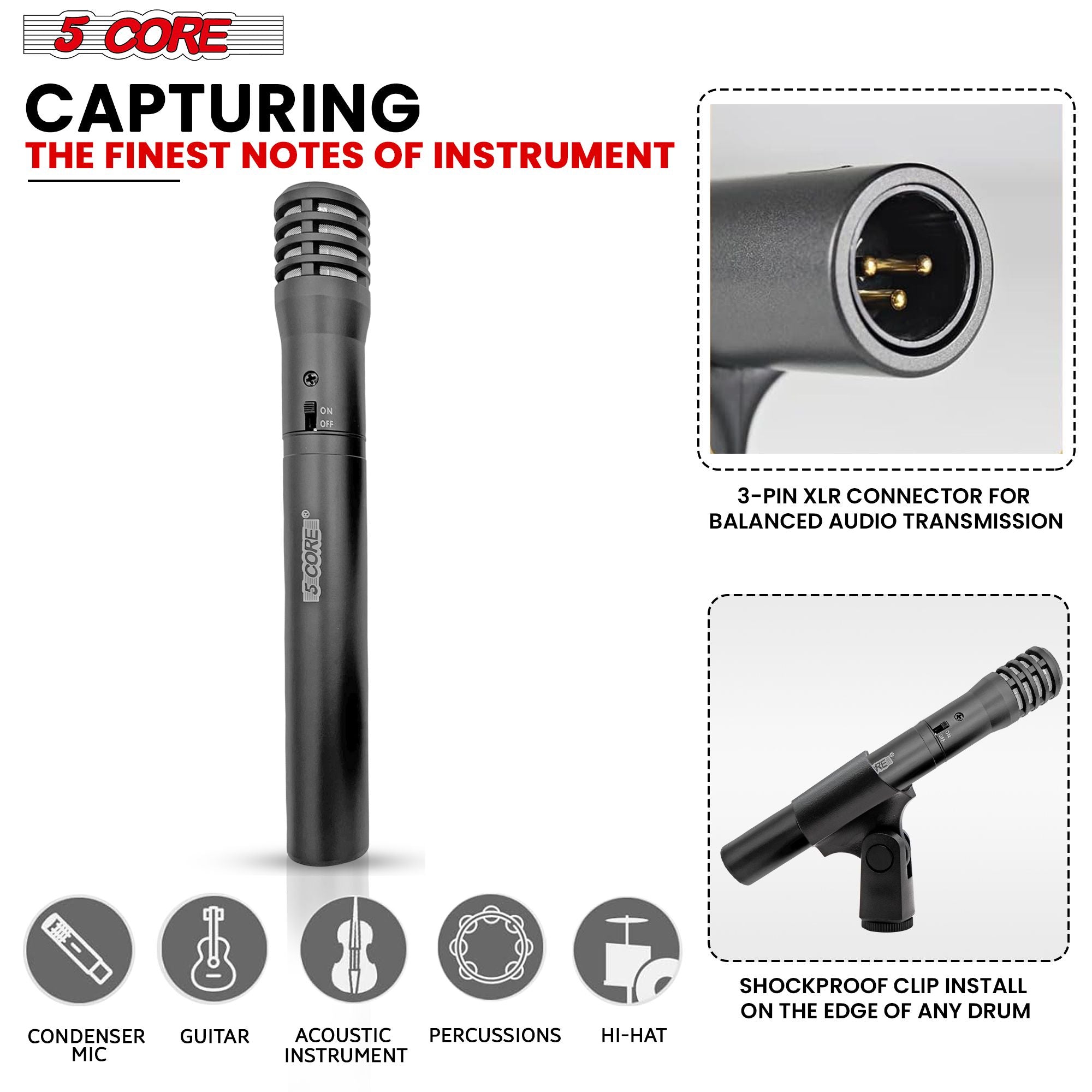 5 CORE Professional Instrument Microphone Pencil Mic Condenser Cardioid Unidirectional Stick Microfono with Windscreen Mic Clip & Case - INSTRU MIC 100 BLK