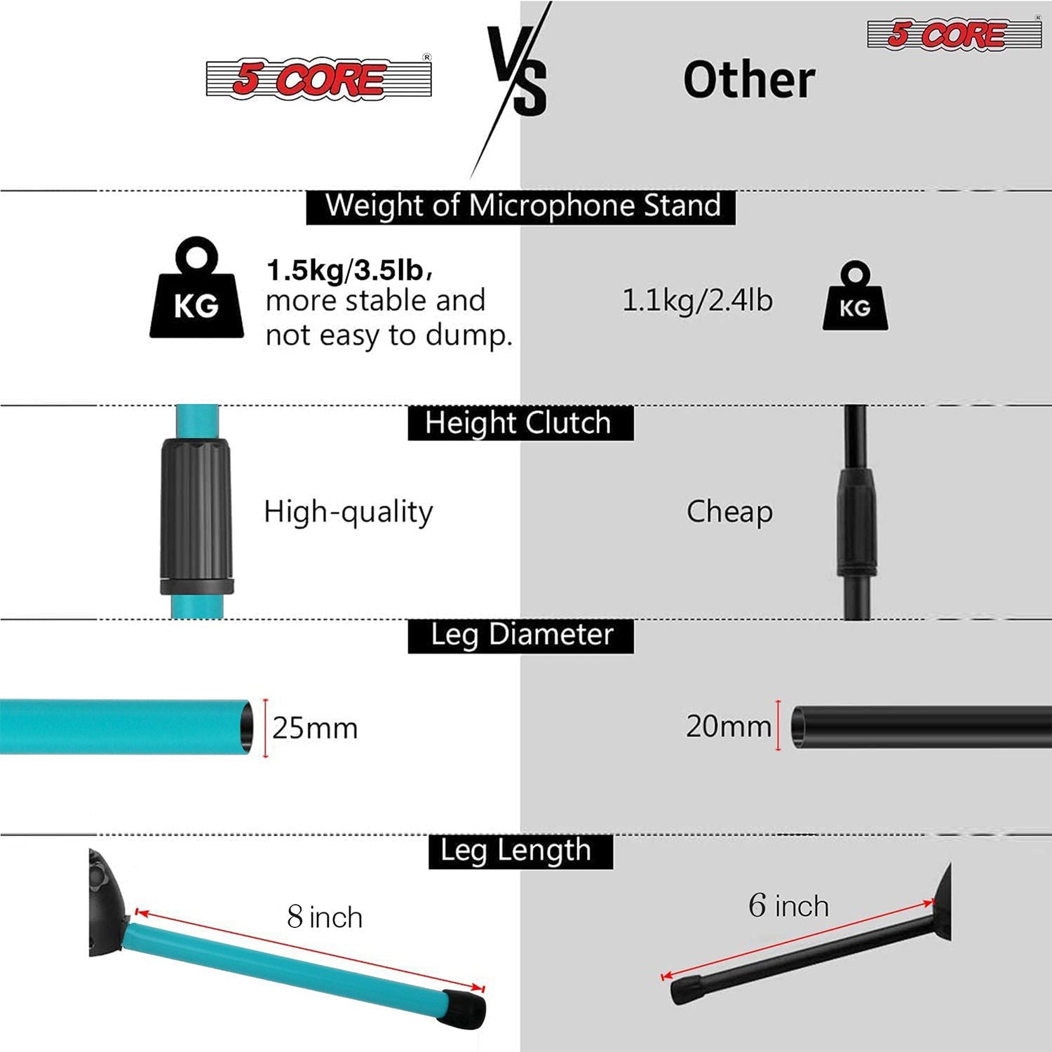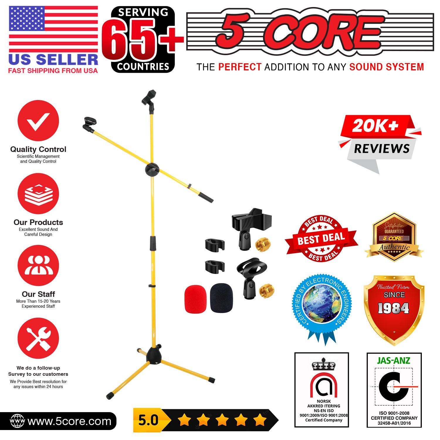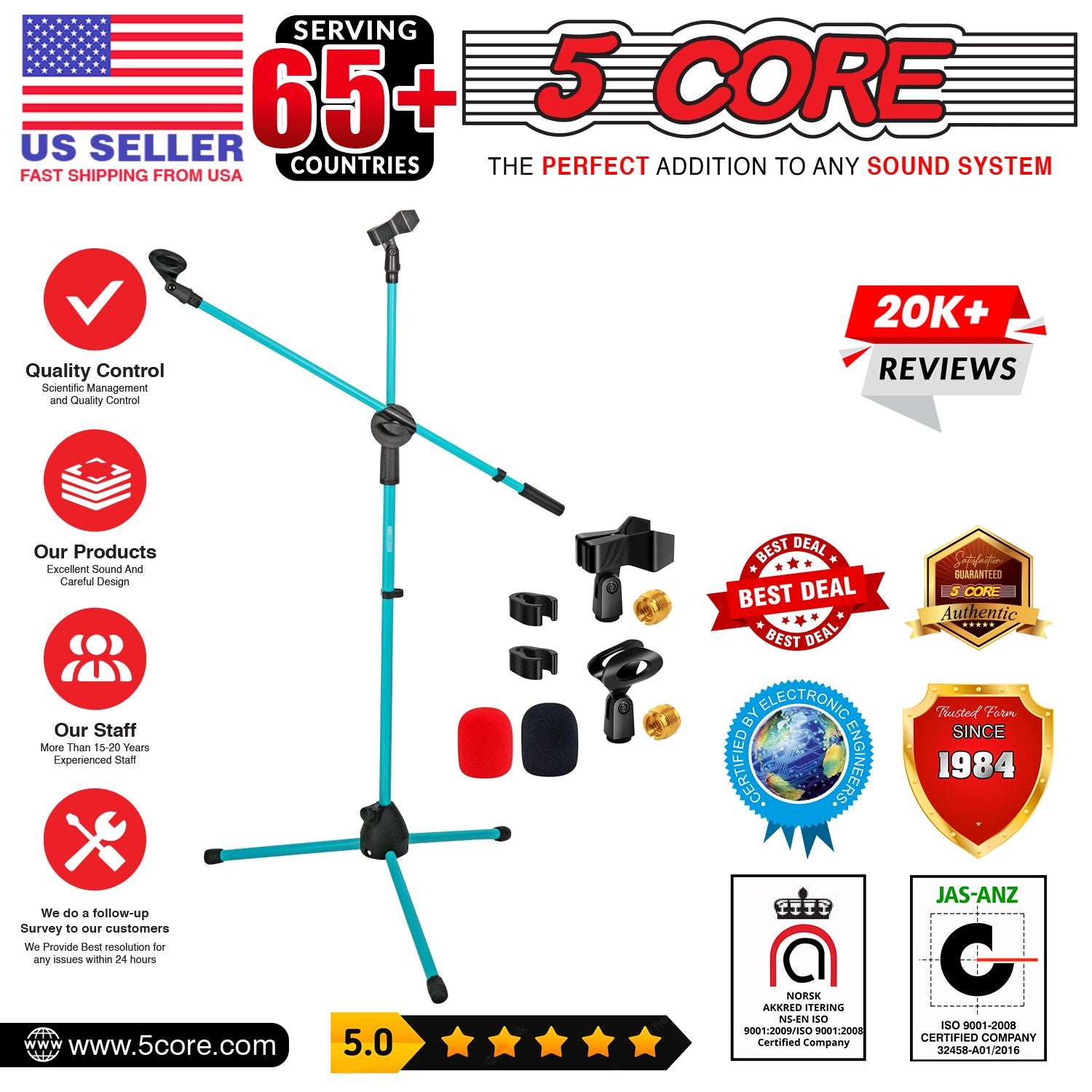 The 5 Core mic stand has adjustable height. The minimum height is 31 inches, and the maximum height is 76inches. The 30 inch boom arm rotates 360 degrees for easy positioning, it can be lowered to 2 inches from above the ground. The tripod leg design features sturdy metal legs with rubber caps, making it stable even on uneven surfaces. The heavy duty mike stand has a strong metal build quality and reinforced clutch, holding up to 3.5 lbs. This floor mic stand comes with 2 mic holders and 3/8" to 5/8" screw adapters, fitting most mics and accessories. Portable soporte de micrófono, collapsible design, and can be assembled in minutes. Perfect for anyone who needs a reliable, versatile mic stand. |
